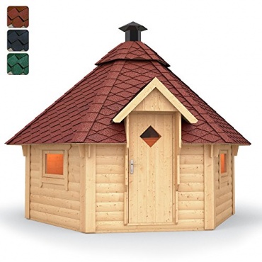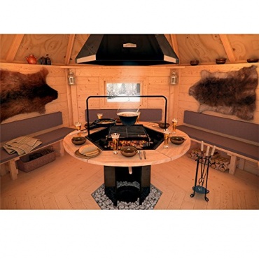 Die sechseckige Party- und Grillhütte besteht aus gesundastigem, gehobelten und gefasten Fichtenholz. Eine massive Tür mit Lichtausschnitt und Isolierverglasung, inklusive Schloss und Drückergarnitur, ermöglicht Zutritt. Die Wand aus Doppel-Nut- und Feder-Blockbohlen in Rundbohlenoptik wird über stabile Verbindungen errichtet. Im Inneren sorgen massiver Fußboden, Sitzbänke und Fenster für urige Gemütlichkeit und Komfort. Im Mittelpunkt steht der STOVEMAN Marken-Stahlofen. Scheitholz und Grillkohle sind geeignete Brennmaterialien. Als Zubehör stehen ein eckiger, 40x40 cm großer und ein runder Grillrost 35 cm bereit. Ein Schwenkarm, Ascheschieber, U-Rahmen mit Hängehaken für Glühwein, Suppen, Gulasch sowie 6 abnehmbare Holztische garantieren geselliges Vergnügen.