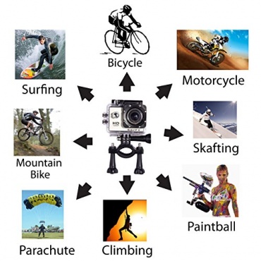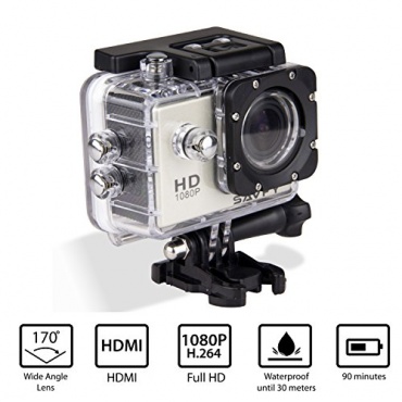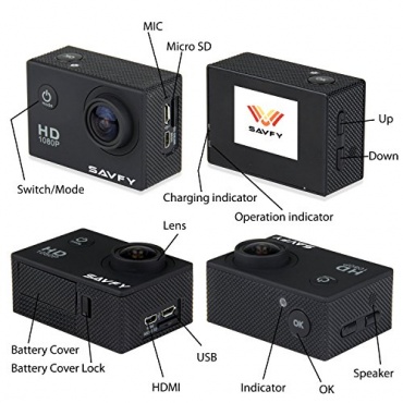 Die SAVFY® SJ4000 Sport Actionkamera gefällt durch ihre ultrakompakten Abmessungen, durch ein geringes Eigengewicht sowie durch eine einfache Bedienung. Sie ist mit umfangreichen technischen Features ausgestattet und kann als Unterwasserkamera, bei beliebigen Outdooraktivitäten, als Dashcam und als Überwachungskamera eingesetzt werden. Mit der qualitativ hochwertigen Kamera können brillante Videos in Full-HD-Qualität, Foto- und Audioaufzeichnungen vorgenommen werden. Ein umfangreiches Zubehörpaket inklusive eines zweiten Akkus ist ebenso im Lieferumfang der vielseitigen Outdoorkamera enthalten.