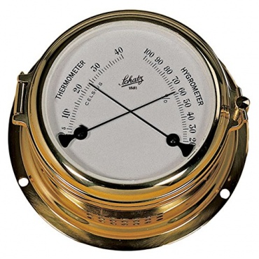 Der messing farbene Schatz 1881 Midi 155 Comfortmeter ist ein Druckmesser, welcher mit einem zweifach lackiert weißem Zifferblatt mit einem Durchmesser von 110 Milimeter ausgestattet ist. Der kompakte Druckmesser vereint Thermometer und Hygrometer Skala in einem.