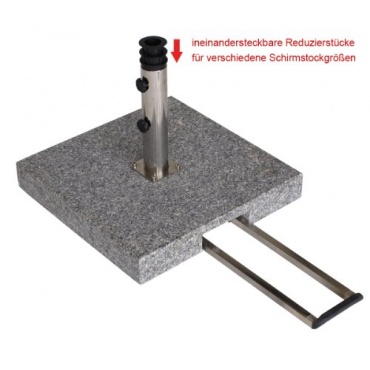 Der geschliffene und polierte Schirmständer aus Granit ist mit Rollen und einem ausziehbaren Griff aus Metall ausgestattet. Das stabile Edelstahlrohr kann Schirmstöcke bis zu einer Stärke von sechzig Milimeter aufnehmen. Für kleinere Schirmstöcke von 58, 48 und 38 Milimeter sind Reduzierstücke in der Lieferung enthalten. Der Ständer kann auch für Wäschespinnen, Schilder oder Fahnen verwendet werden.
