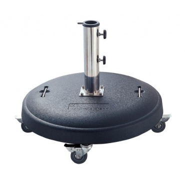 Der schwarze runde Schirmständer mit Rollen ist aus gegossenem Polymerbeton gefertigt und hat ein Eigengewicht von 50 Kilogramm. Der stabile Ständer ist für Schirme mit Mittelstock bis zu einem Durchmesser von 350 Zentimeter empfohlen. Der Ständer ist auch für Wäschespinnen, Schilder oder Fahnen verwendbar.