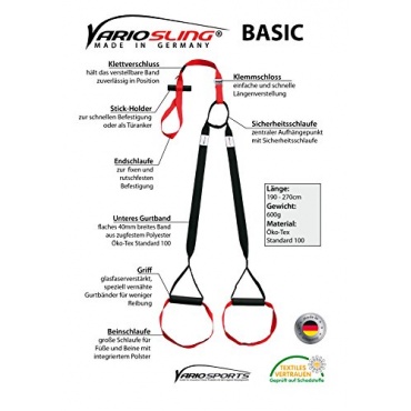 Der Schlingentrainer von Variosling ist ein sehr gutes Trainingsgerät, das Platz sparend verstaut werden kann und sehr effektiv ist. Denn dieser Schlingentrainer ist perfekt dafür geeignet, die verschiedensten Muskelpartien im Körper zu trainieren. So kann man vor allem die Arme und Beine problemlos trainieren. Natürlich gibt es auch eine genaue Anleitung für die Trainingsübungen. Auf einer DVD sind die Übungen nämlich gut dargestellt.