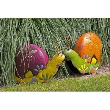 Noch leichter zu halten sind allerdings diese beiden Exemplare. Sie bestehen aus Metall, das auffällig bunt bemalt ist. Mit einer Breite von 38 cm und einer Höhe von 24 cm lässt sich das Schneckenpaar leicht in seinen neuen Lebensraum integrieren. Dieser könnte auf dem Balkon sein, inmitten von Grünpflanzen oder im Garten. Auch auf der Terrasse fügen sich diese stilvollen Tierfiguren aus Metall harmonisch ins Bild.