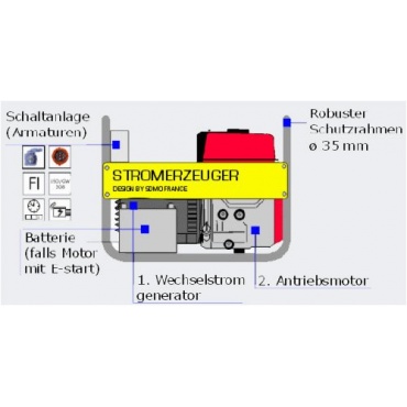 Mit einem Honda Motor OHV GX 200 ist der Stromerzeuger ausgestattet. Der Motor vom Stromerzeuger läuft mit Benzin Bleifrei und hat eine Leistung von 3.75 kVA. Die beiden Steckdosen haben jeweils eine Leistung von 230 Volt. Der Stromerzeuger hat ein Benzintank mit 3.1 Liter und einer maximalen Laufzeit von 2.4 Stunden. Mit seinem Tragerahmen ist der Stromerzeuger einfach zu transportieren, wenngleich er mit 41 kg nicht leicht ist. Die Lautstärke vom blau/schwarzen Stromerzeuger beträgt 95 dB.
