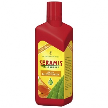 Flüssiges Vitalnahrungskonzentrat der Firma Seramis für alle Balkonpflanzen. Zur Unterstützung der Blütenbildung beim Sommerflor wurde der Phospatgehalt der Vitalnahrung höher dosiert. Um einem massiven vegetativen Wachstum entgegen zu wirken, wurde der Stickstoffanteil in der Vitalnahrung reduziert. Leichtes, sauberes und exaktes Dosieren des Konzentrats durch die Dosierungskammer. Gleichmäßige und schonende Versorgung der Pflanzen mit den wichtigsten Mineralstoffen durch Bewässerungsdüngung.