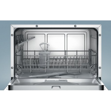Der weiße Tischgeschirrspüler von Siemens ist ein kompaktes Gerät, das schnell in der Küche aufgestellt werden kann und nach kurzer Anschlusszeit sofort betriebsbereit ist. Wenn man zwischendurch ein wenig Geschirr gereinigt haben möchte, aber selbst dafür keine Zeit findet, dann erweist er sich als angenehmer Helfer, denn er kann bis zu sechs Maßgedecke gleichzeitig reinigen. Das Gerät verfügt über einen Beladungssensor und fünf Programme zur Geschirreinigung.