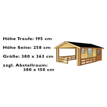 Das Blockhaus sorgt durch seine extrem starken Holzwände für eine faszinierende Stabilität. Das Haus besitzt eine Grundfläche von 13,80 m² und die Terrasse von 5,70 m². Das gesamte Haus hat ein Gewicht von 882 kg. Mit einem Echtglas Fenster in der Wand und ein Dreh- und Doppelfenster in der Front, die jeweils eine Größe von 57 x 70 cm haben, ist das Blockhaus sehr hell. Bei einem seitenverkehrten Aufbau ist die Tür mit dem Fenster austauschbar.
