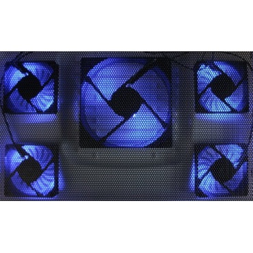 Der SKYGAMES Notebook Kühlständer ist für Notebooks mit einer Größe zwischen 10 und 17 Zoll geeignet und verfügt über insgesamt 5 Lüfter: 1 großen (12 cm) Lüfter sowie 4 kleinere (7 cm) Lüfter, welche mit blauer Beleuchtung ausgestattet sind. Diese Beleuchtung ist hinsichtlich einer guten Wärmeableitung besonders hervorzuheben. Besonders komfortabel wird dieser Notebook Kühlständer durch die gepolsterte Handballenauflage sowie die ausklappbaren Füße. Ein großer Pluspunkt ist auch noch die kompakte Bauweise, wodurch es trotzdem noch sehr komfortabel ist, sollte man den Kühlständer einmal auf seinem Schoß stehen haben.