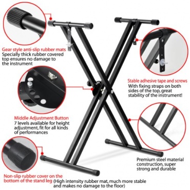 - sehr günstig in der Anschaffung, klassisches Design in Schwarz, kann in der Höhe und in der Breite verstellt werden, gute Tiefe von 45,5 cm für einen stabilen Stand, einfach auf- und abzubauen, kann platzsparend zusammengeklappt werden, x-Form für einen sicheren Stand, ziemlich robust gefertigt, Gummierungen an Füßen für einen rutschfesten Stand, Auflagefläche gummiert für rutschfestes Spielen des Keyboards