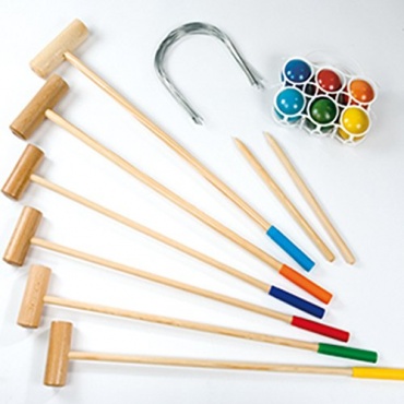 Das Set hat eine Ausstattung, die aus sechs Schlägern besteht, aus sechs Toren und sechs Kugeln. Außerdem befinden sich auch jeweils ein Start- und ein Schlusspfosten mit in diesem Set. Das Spiel besteht aus hochwertig verarbeitetem Holz und verspricht so eine lange Lebensdauer. Mit diesem Spiel werden die Familie und auch die Freunde sehr viel Vergnügen haben. Mit dem Krocketspiel können Turniere gespielt werden, ebenso können auch Mannschaften die aufregenden Spiele ausgetragen.
