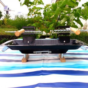 Die Holztragegriffe sind sehr praktisch, um den Grill zu deplatzieren. Der Grill hat keinen Deckel, aber er verfügt über eine Tropfwanne, sodass triefendes Fett aufgefangen werden kann. Der Grill wird mit Holzkohle betrieben und ist als Einsteigergrill gut geeignet.