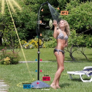 Mit dieser Dusche kann man sich im Garten, auf der Terrasse oder am Pool erfrischen, und das mit angenehm warmen Wasser, denn das Wasser erwärmt sich innerhalb von 2 Stunden bis auf 60° C mit dieser faszinierenden Solardusche. Das Wasser ist dann für bis zu 7 Duschen zu nutzen. Mit der Mischbatterie kann das Wasser und die Temperatur geregelt werden. Die Dusche kann überall genutzt werden, ob am Pool oder im Garten auch im Urlaubauf auf dem Campingplatz.