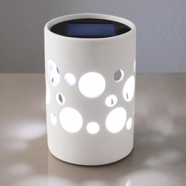 Die Solar-LED-Leuchte von Konstsmide ist ganz aus edlem weißen Keramik geschaffen und verfügt über unreglmäßig verteilte, kreisrunde Öffnungen, durch die das Licht herausströmen kann, Die Lampe wird mit Solarlicht betrieben und kann manuell ein- und ausgeschaltet werden. Ist die Lampe vom Sonnenlicht voll aufgeladen, so kann man mit sechs Stunden Licht rechnen. Beim Eintritt der Dämmerung schaltet sich die Leuchte automatisch ein.