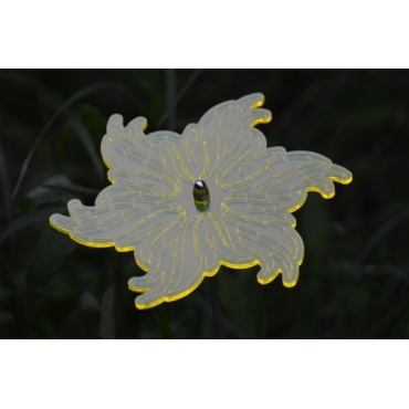 Stilvoller Sonnenfänger aus gelbem Acrylglas, mit dem Motiv einer Blüte. Mit dem angebrachten Stab lässt sich dieses kleine Dekorationsobjekt schnell und problemlos überall einsetzen. Entweder in die Erde im Garten, in die Mitte eines Blumenbeetes, oder auch in einen Blumentopf auf dem Balkon.