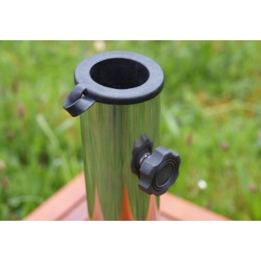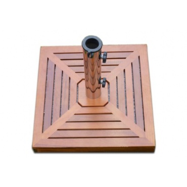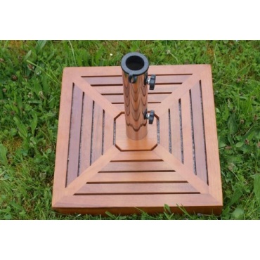 Die quadratische, 6 cm starke Bodenplatte ist 46,5 cm groß. Sie wird durch eine abnehmbare und optisch ansprechende Hartholzplatte verkleidet. Es empfiehlt sich, die Verkleidung bei schlechtem Wetter innen aufzubewahren oder regelmäßig mit wetterfester Lasur zu pflegen. Im Lieferumfang befindet sich ein Edelstahlrohr mit seitlichen Schrauben, die zur Arretierung des Sonnenschirmes dienen. Der Innendurchmesser fasst handelsübliche Schirme zwischen 39 und 50 mm. Für Ampelschirme ist der Ständer nicht geeignet.
