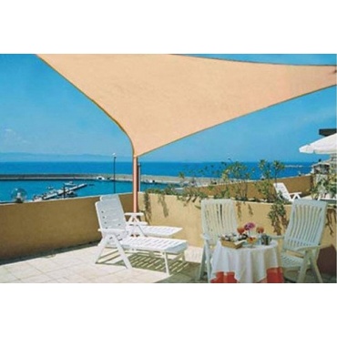 Das beige dreieckige Sonnensegel ist aus circa 180 Gramm hochfestem Polyethylen je Quadratmeter gefertigt. Dieses Gewebe bietet einen UV Schutz und bildet keinen Schimmel. Das Sonnentuch hat die Größe von 3,6x 3,6x 3,6 Meter und ist hervorragend verarbeitet. Das schattentuch ist absolut reißfest und wetterfest. Die integrierten Spanngurte sorgen für eine sichere Befestigung. Am Rand ist das Sonnensegel doppelt vernäht.