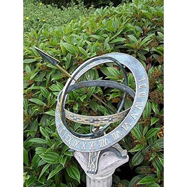 Die Sonnenuhr aus Bronze wird in Handarbeit hergestellt. Sie besitzt die Abmessungen 42 x 40 x 50cm. Da es sich bei jeder Sonnenuhr um ein Unikat handelt, können die Maße und die Farben leicht variieren. An der Unterseite der dekorativen Sonnenuhr aus Bronzeguss sind als Sicherung gegen Diebstahl Gewindebohrungen angebracht worden. Die wetterfeste Sonnenuhr ist ein dekorativer Blickfang im Garten, auf dem Balkon oder der Terrasse und zeigt die korrekte Stunde an. Die Sonnenuhr ist harmonisch in jeden Garten zu integrieren.