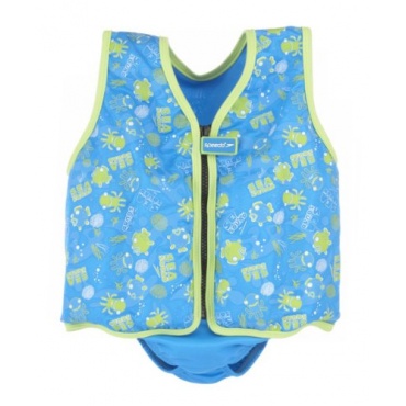 Die hübsche Kinder Sea Squad Schwimmweste mit abnehmbarer Hose wird von der Firma Speedo angeboten. Die Sea Squad Schwimmweste unterstütz das Kind beim Schwimmen lernen sich über Wasser zu halten. Die schöne Schwimmweste in der Farbe Blau, hat grüne Ränder und grüne Unterwasser Motive. Die leichte Schwimmweste besteht komplett aus Polyamid, die integrierten Schaum Einlagen, die für den nötigen Auftrieb sorgen, sind hingegen aus Polyester.