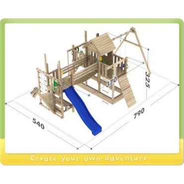 Die bespielbare Ausstattung ist enorm. Neben zwei Schaukeln und einer Kletterwand verfügt die Spielanlage über zwei unterschiedliche Kletterwände, wovon die eine mit Klettersteinen zu bewältigen ist. Die Wackelbrücke fördert das Gleichgewicht.
