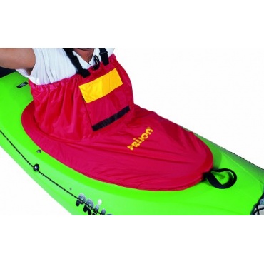 Die Spritzdecke wird von Prijon angeboten. Sie besteht aus Nylon, welches sehr weich und leicht ist. Am Kamin ist eine Tasche aufgenäht, die das Aufbewahren von schnell greiffbaren Gegenständen möglich macht. Die Marke und der obere Teil der Tasche sind in gelb gehalten. Die Kordelzüge sowie die Schulterträger und ein modischer Streifen auf der Tasche sind schwarz.
