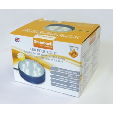 Die Steinbach LED Poolbeleuchtung ist eine Beleuchtung für alle gängigen Aufstellpools mit einer Wandstärke von bis zu 0.8 Millimeter. Die Poolleuchte mit einem Durchmesser von 8.7 Zentimeter kann mittels Magneten einfach und schnell am Pool als auch außerhalb befestigt werden. Alternativ dazu bietet sich eine im Lieferumfang enthaltene Stahlplatte zur Fixierung am Pool an. Der Anschluss erfolgt über einen 12 Volt Schutztransformator und ein Kabel mit einer Länge von 6 Metern.