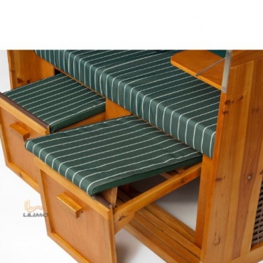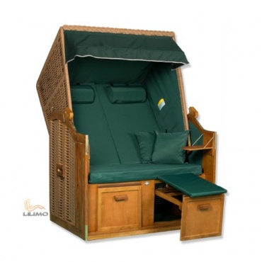 Der Strandkorb Ostsee 2in1 Convertible ist in grün erhältlich und beinhaltet zusätzlich eine Abdeckhaube, zum Schutz vor Wind und Wetter. Der Bezug ist aus 100%igen Polyester und der Korpus Wacholder aus Plantagenanbau. Die zwei Zusatzbezüge können abgenommen und bei 40 Grad gewaschen werden. Der Strandkorb besitzt auch innen zwei Taschen zum Verstauen von Zeitungen und Zeitschriften. Sowohl ist er auch für maximal zwei Personen geeignet und hat zwei Schwenktischen und zwei Fußablagen, dass bei Nichtbenutzen einfach zusammengeklappt werden kann.