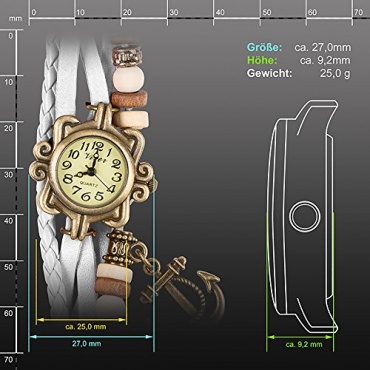 Die Taffstyle® Damen Analog Armbanduhr Lederarmband kommt in einem edlen Vintage Design daher. Das Armband besteht bei diesem Modell aus hochwertigem Leder und das Gehäuse aus robustem Metall. Weiterhin hat das Gehäuse einen Durchmesser von 37 mm und die Gehäusehöhe liegt bei 9,2 mm. Das Gewicht beträgt 25 g.