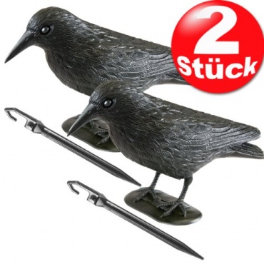 Das Set bestehenden aus zwei schwarzen Raben-Figuren aus pflegeleichtem und robustem Kunststoff wird mit Anwendungsanleitung und Montagezubehör geliefert. Die Figuren sind wetterfest und UV-beständig, sodass die dunkle Farbe über eine lange Zeit erhalten bleibt. Die Figuren werden am Sammelort der Vögel aufgestellt und vertreiben durch das täuschend echte Aussehen die Kleinvögel von ihren Plätzen. Die 36 x 10 x 23 cm großen Raben können hängend oder stehend montiert werden, sollten jedoch oft in der Position variiert werden, damit keine Gewöhnung an die Attrappe stattfindet und der optimale Schutz bestehen bleibt.