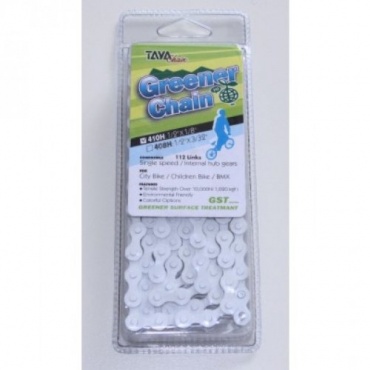 Die TAYA Kette 410-H weiss hat Teflon Color Coating. Die 410H-Serie der Taya Fahrradketten ist Chromfrei hergestellt und damit ein sehr umweltfreundliches Produkt. Diese Kette ist ompatibel mit Single Speed 1/2" x 1/8", BMX Rädern, Singlespeed Bikes und auch Rädern mit Nabenschaltung. Die Anzahl der Glieder ist 112. Durch Ihre Produktion bedingt ist diese Kette von Taya wartungsarm ud bedarf nur sehr wenig Schmierung.