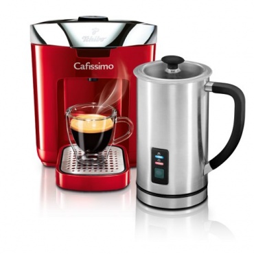 Die rote Tchibo Cafissimo Kaffeekapselmaschine DUO Für Espresso und Caffè Crema bereitet mit nur einem Knopfdruck aromatsichen Kaffee zu. Die Maschine kann mit aromaversiegelten Kaffeekapseln in verschiedenen Sorten, mild, kräftig und entkoffeiniert verwendet werden. Die Getränkemenge ist individuell programmbierbar.
