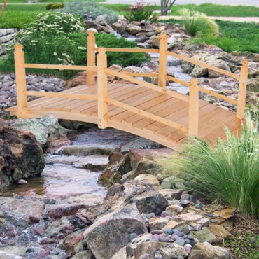 Die Gartenbrücke von TecTake eignet sich ideal, um Bachläufe, Teiche oder kleine Gräben zu überbrücken. Das geschwungene Design wirkt sehr edel und wertet den Garten optisch auf. Die Brücke selbst ist mit einer Holzschutzlasur überzogen und erhält so eine höhere Witterungsbeständigkeit. Als Material wurde Kiefernholz gewählt, das sich harmonisch in die natürliche Umgebung integrieren kann.