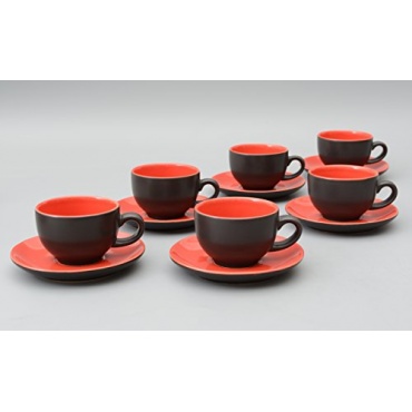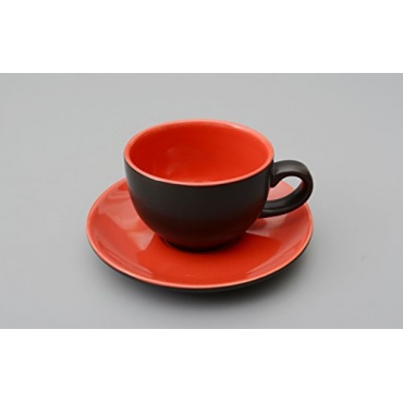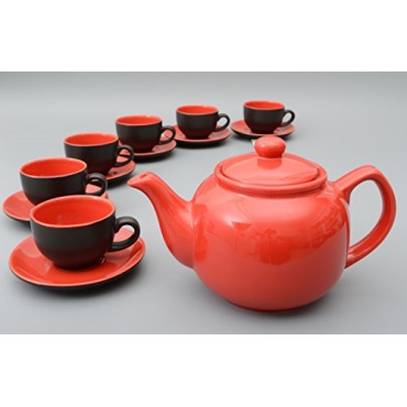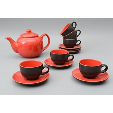 Zum Service zählen ein Kanne, sechs Tassen und sechs Unterteller. Die Kanne besitzt ein Fassungsvermögen von 1,2 l. Die Tassen nehmen bis zu 150 ml auf. Die 13 Teile des Sets bestehen aus glänzendem roten Porzellan. Einzig die Unterseite der Teller und die Außenseite der Tassen sind schwarz gehalten. Zur Reinigung können alle Teile in die Spülmaschine gegeben werden. Der Deckel der Kanne kann von Nutzern komplett abgenommen werden.
