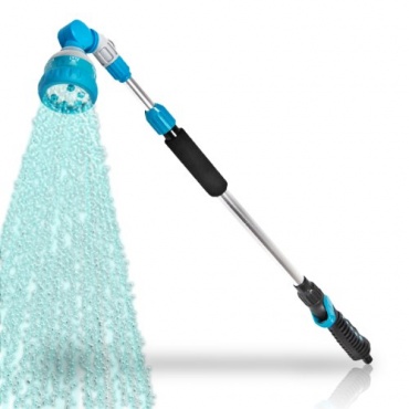 Wer seinen Garten gut bewässern und auch schwierige Stellen gut erreichen will, der ist mit diesem Teleskop- Gießstab bestens aufgehoben. Er sit von etwa 70 bis auf 100 cm ausziehbar. Derr Brausekopf lässt sich um bis zu 180 Grad drehen und verfügt über sechs Wasserstrahleinstellungen. Ein weiterer Vorteil ist, dass sich der Wasserdruck am Handgriff stufenlos regulieren lässt. Darüber hinaus ist der Gruiffstock des Gießstabes Gummi-ummantelt, ergonomisch gerippt und gerippt.