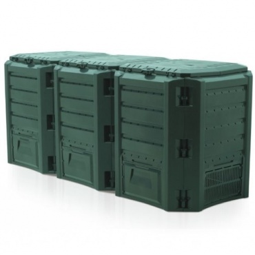 Dieser Kunststoffkomposter besteht aus drei verbundenen Behältern. Er hat eine Größe von 198 x 72 x 83 cm. Er ist witterungsbeständig und wetterfest. Dank Klicksystem wird der Komposter einfach zusammengesteckt. Seine großen Deckel lassen sich einzeln öffnen und erleichtern das Befüllen der einzelnen Behälter. Jeder Behälter verfügt außerdem über eine Klappe im unteren Bereich. Durch diese wird der fertige Humus entnommen.