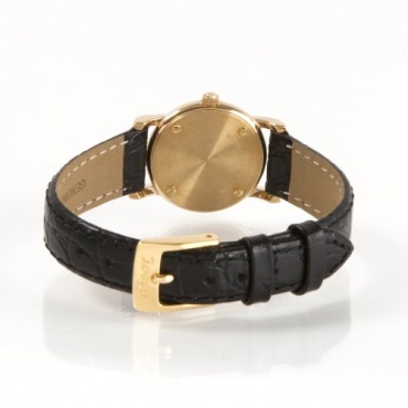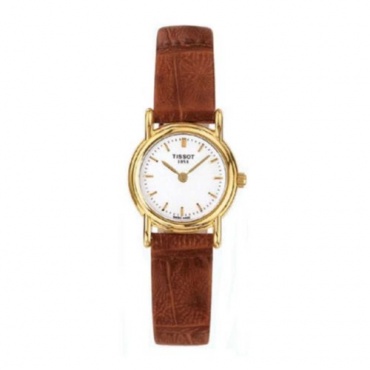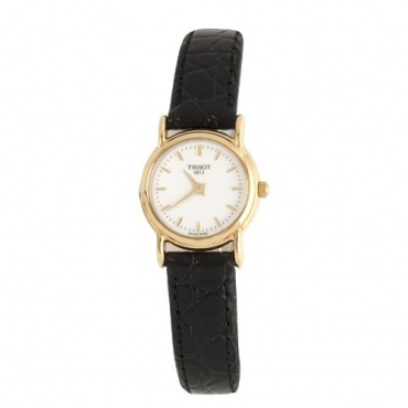 Die schlichte Uhr ist in einer kleinen Größe gestaltet, die auch am kleinen Handgelenk ausgezeichnet wirkt. Die Uhr ist mit einer Gehäusehöhe von fünf Millimetern auch besonders flach und trägt sich angenehm. Das weiße Zifferblatt ist mit goldenen Strich Indizen versehen, welche die Stunden markieren. Die ebenfalls goldenen Zeiger können vor dem weißen Hintergrund ausgezeichnet abgelesen werden. Der einzige Schmuck ist das Tissot Emblem im oberen Teil des Zifferblatts. Ein schmales schwarzes Lederband mit Dornschließe hält die Uhr am Gelenk.