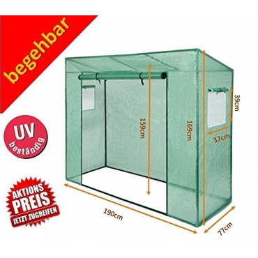 Das Gewächshaus lässt sich über eine aufrollbare Tür mit Reißverschluss betreten. Zwei seitliche Fenster sorgen für eine variable Belüftung. Mit der passenden Bewässerung kann ein geeignetes Raumklima erzeugt werden. Die Fenster sind mit äußeren Klettbändern und Insektenschutzgittern versehen. Die Gesamtkonstruktion wird durch massive Metallstäbe gehalten. Die Dachkonstruktion ist verstärkt und hält auch Belastungen durch Schnee stand. Der Hersteller gewährt ein Garantie von zwei Jahren.