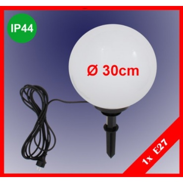 Einen Durchmesser von 30cm hat Trango® LED Gartenkugelleuchte 300mm Durchmesser TG300B. Gefertigt ist die Gartenkugelleuchte aus Kunststoff. Für den Betrieb der LED Gartenkugelleuchte von Trango ist eine Stromversorgung von 230 Volt notwendig. Zum besseren Anschluss verfügt die Gartenkugelleuchte über ein Anschlusskabel mit einer länge von 5m. Der Stromverbrauch der LED-Lichter bei der Gartenkugelleuchte beträgt 2 Watt. Die Lebensdauer der Trango Gartenkugelleuchte wird mit 25000 Stunden angegeben. Zur Aufstellung der Leuchte verfügt diese über einen Erdspieß. So kann man sie einfach in den Boden stecken, anschließen und fertig. Vom Design her, ist die Gartenkugelleuchte in einem weiß/schwarzen Design gehalten.