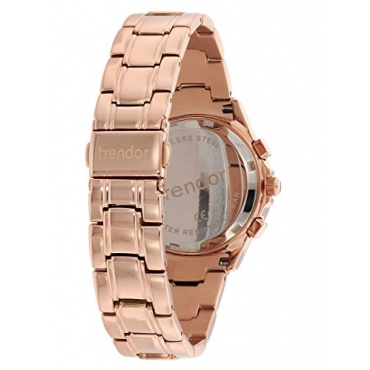 Die rotgold gehaltene Damen Armbanduhr ist eine moderne Uhr der Marke trendor. Das pinke Zifferblatt ebenso wie das rotgold ionen plattierte Gehäuse und Armband umspielen das weibliche Handgelenk und bilden ein modernes Highlight am Handgelenk. Die sehr feminine Uhr besitzt hochwertiges Mineralglas und sogar wasserdicht geprüft bis 5 bar.