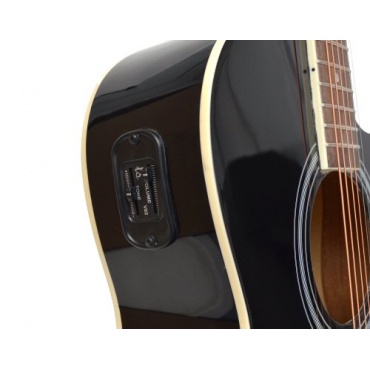 Der eingebaute 4- Band Tonabnehmer und Equalizer sorgt dafür, das diese Gitarre akustisch oder als elektrische Gitarre über den Anschluss an die Klinkenbuchse einsetzbar ist. Die Saitenhöhe ist einstellbar und ermöglicht damit eine präzise Bespielbarkeit. Die Saiten sind aus strapazierfähigem Stahl. Zur Befestigung der Gitarre an einen Gurt sind zwei Knöpfe angebracht die eine schnelle und einfache Montage möglich machen. Der Kabel für den Anschluss an die Klinkenbuchse ist nicht im Zubehör enthalten. Das leichte Gewicht der Gitarre macht das Handling besonders angenehm.