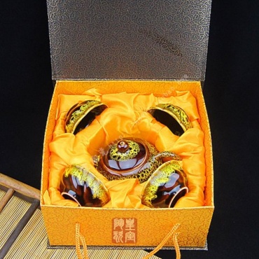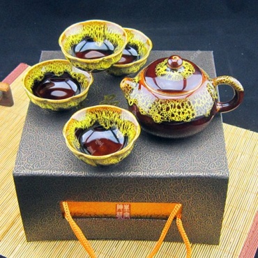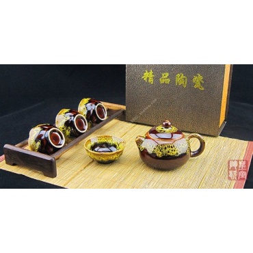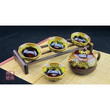Das Ufingo Juni Kung Fu Teeservice ist aus Keramik gefertigt und besteht aus vier Tassen und einer Kaffeekanne. Eine Tasse hat ein Fassungsvermögen von 35 Mililiter und in die Kanne passen 135 Mililiter. Das gelbbraune Teeservice ist der absolute Hingucker in der Teerunde.