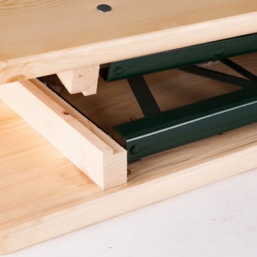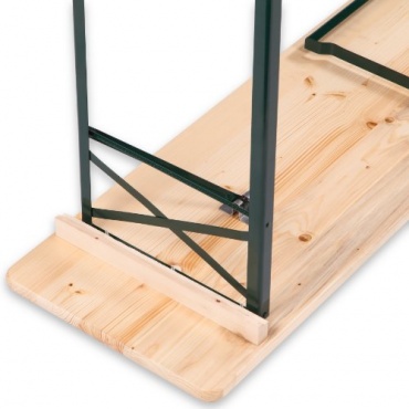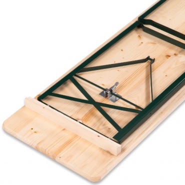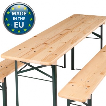 Ultranaturas Bierzeltgarnitur mit dem Namen "Wiesn" gehört zu den klassischen Bierzeltgarnituren. Die Sitzflächen der Bänke und die Tischplatte sind aus massivem Holz gefertigt, geschliffen und abschließend lasiert worden. Sie stehen auf Metallfüßen, die sich anklappen lassen, wodurch die komplette Garnitur gut transportiert werden kann. Auch das Verstauen bei Nichtbenutzung gelingt optimal, da zwei Bänke genau die Breite eines Tisches einnehmen und sich eine Garnitur so in liegender Position wunderbar stapeln lässt, um bei Bedarf die Grundlage für weitere Garnituren obendrauf zu bilden.