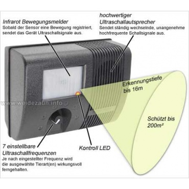 Dieser Ultraschall Vertreiber mit Bewegungsmelder ist in der Lage, Marder, Waschbären, Katzen und Hunde zu vertreiben. Das Produkt verfügt über sieben einstellbare Schall - und Ultraschallfrequenzen, mit denen verschieden Tiere abgeschreckt werden können. Sobald der Bewegungsmelder ein Tier wahrnimmt, fängt der Marderschreck an, eine Gruppe von Schallsignalen auszusenden, deren Frequenzen zuvor festgelegt wurden. Den Tiere sind die unterschiedlichen Frequenzen so unangenehm, dass sie sich freiwillig zurück ziehen.