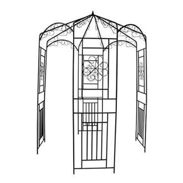 Mit der Größe von 250 x 160 cm ist der Rosenbogen oder Pavillon ein Blickfang für jeden Garten. Ausgestattet mit Tisch und Stühlen oder einer Bank kann es zu einem lauschigen Plätzchen im eigenen Garten werden. Das Metallmaterial und die dunkelgrüne Farbe mit den ansprechenden Verzierungen fügen sich harmonisch in die Berankung der Rosen oder Kletterpflanzen ein.