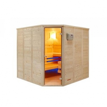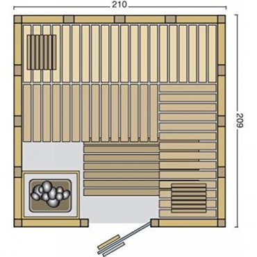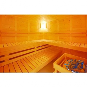 Die Massivholzsauna wurde aus vierzig Milimeter dicker nordischer Fichte gebaut. Die Inneneinrichtung der Gartensauna ist aus Linde und bietet drei Liegen mit jeweils sechzig Zentimeter, sowie zwei Rückenlehnen und zwei angenehme Kopfstützen. Des Weiteren befinden sich eine Zwischenbankverkleidung, ein Ofenschutzgitter und ein Fußrost in der Sauna. Die Glastür besteht aus stilvollem Sicherheitsglas.