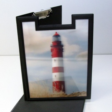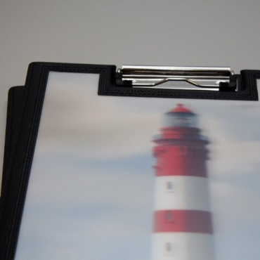 Das Clipboard ist aus schwarzem Kunststoff gefertigt und ist damit im klassischen Design. Auf der Vorderseite befindet sich ein 3D Bild eines Leuchtturms. Die 3D Version des Bildes macht das Clipboard sehr schön und besonders. In der Innenseite befindet sich eine Klemme aus Metall, mit der Dokumente festgehalten werden können. Auf der Innenseite befindet sich eine Tasche für weitere Dokumente.