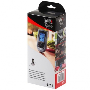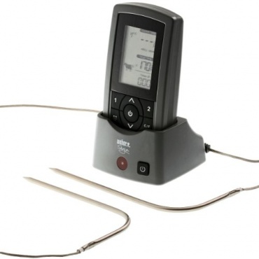Das hochwertige Weber Grillthermometer in graum mit einer blauen LCD Digitalanzeige bietet die Möglichkeit die Temperatur von zwei Fleischstücken gleichzeitig zu überwachen. Das Thermometer ist mit zwei Messfühlern ausgestattet, die ihre Messdaten per Funk über eine Distanz von 75 m übertragen. Die Fühler sind aus lebensmittelechtem Edelstahl und die Reinigung kann durch Abwischen mit einem feuchten Tuch erfolgen.