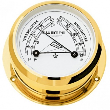 Die Yachtuhr wird über ein Quarz-Batteriewerk betrieben, sie verfügt über ein Ziffernblatt mit römischen Ziffern und einen Sekundenzeiger. Das Barometer gibt zuverlässig den Luftdruck an und lässt Rückschlüsse auf das Wetter der nächsten 24 bis 48 Stunden zu. Praktisch ist auch das Comfortmeter: Es gibt die Luftfeuchtigkeit und die Temperatur an. In einer zusätzlichen Skala zeigt es außerdem, wie weit die beiden zusammenhängenden Komponenten vom Wohlfühlbereich entfernt sind.