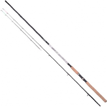 Aus dem Material Kohlefaser verarbeitet ist die Angelrute. Die Rutenlänge bei der Angelrute beträgt 2.40 m, sie ist zweiteilig. Die Angelrute kommt auf ein Wurfgewicht von bis zu 40 Gramm. Die Transportlänge der Angelrute im schwarzen Design beträgt 1.25 m. Insgesamt kommt die Angelrute auf ein Gewicht von lediglich 163 Gramm, sie liegt damit sehr gut in der Hand. Als Zubehör zur Angelrute gehören zwei Wechselspitzen.