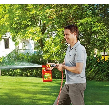 Die Anwendung ist ein Kinderspiel: Der Dünger-Behälter mit seinem Sprühaufsatz wird an den Wasserschlauch gesteckt. Beim Wasserdurchlauf wird das Konzentrat auf die richtige Mischung dosiert und verteilt. Innerhalb von drei Minuten sind mit diesem System 100 Quadratmeter zu düngen. In der Zusammensetzung setzt Wolf auf bewährte Qualität. Ein Wirkstoff-Komplex aus Stickstoff und Eisenchalet stärkt schnell sichtbar den Rasen und vernichtet gleichzeitig vorhandene Moosflächen.