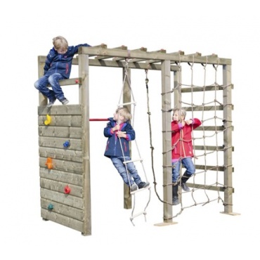 An diesem Klettergerät können sich die Kinder austoben und ihrer körperlichen Fähigkeiten wie Kraft und Ausdauer spielerisch steigern. Die Teamfähigkeit wird unterstützt, da einige Übungen, z.B. das Knotenseil, am Anfang oft nur mit Hilfe anderer bewältigt werden können.